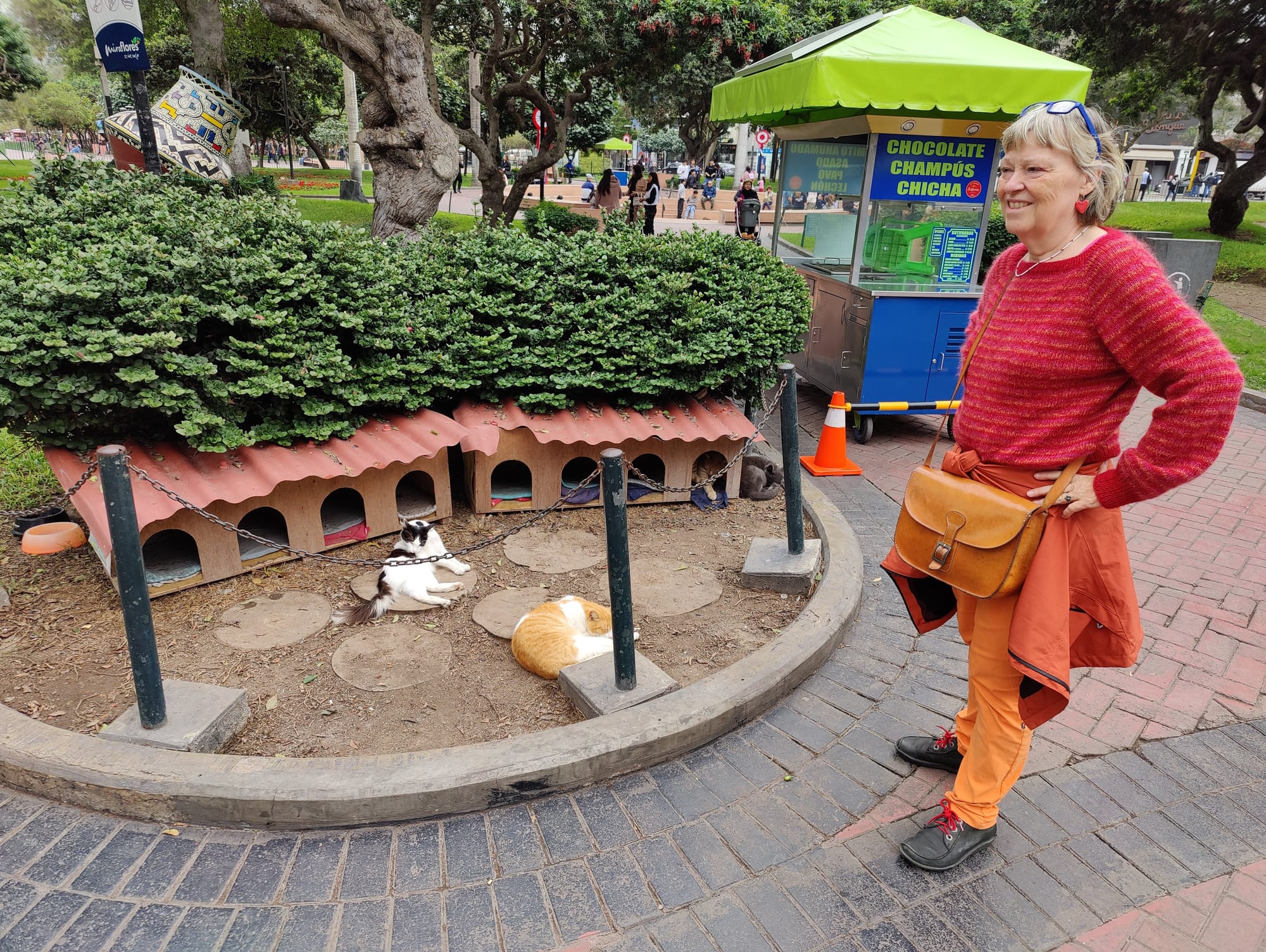 En sjov ting vi så var en park som var katte-venlig. Der var nogle lokale mennesker som sørgede for at forholdene for katte var gode her: Små huse til at sove i, mad og vand. Kattene så sunde ud.