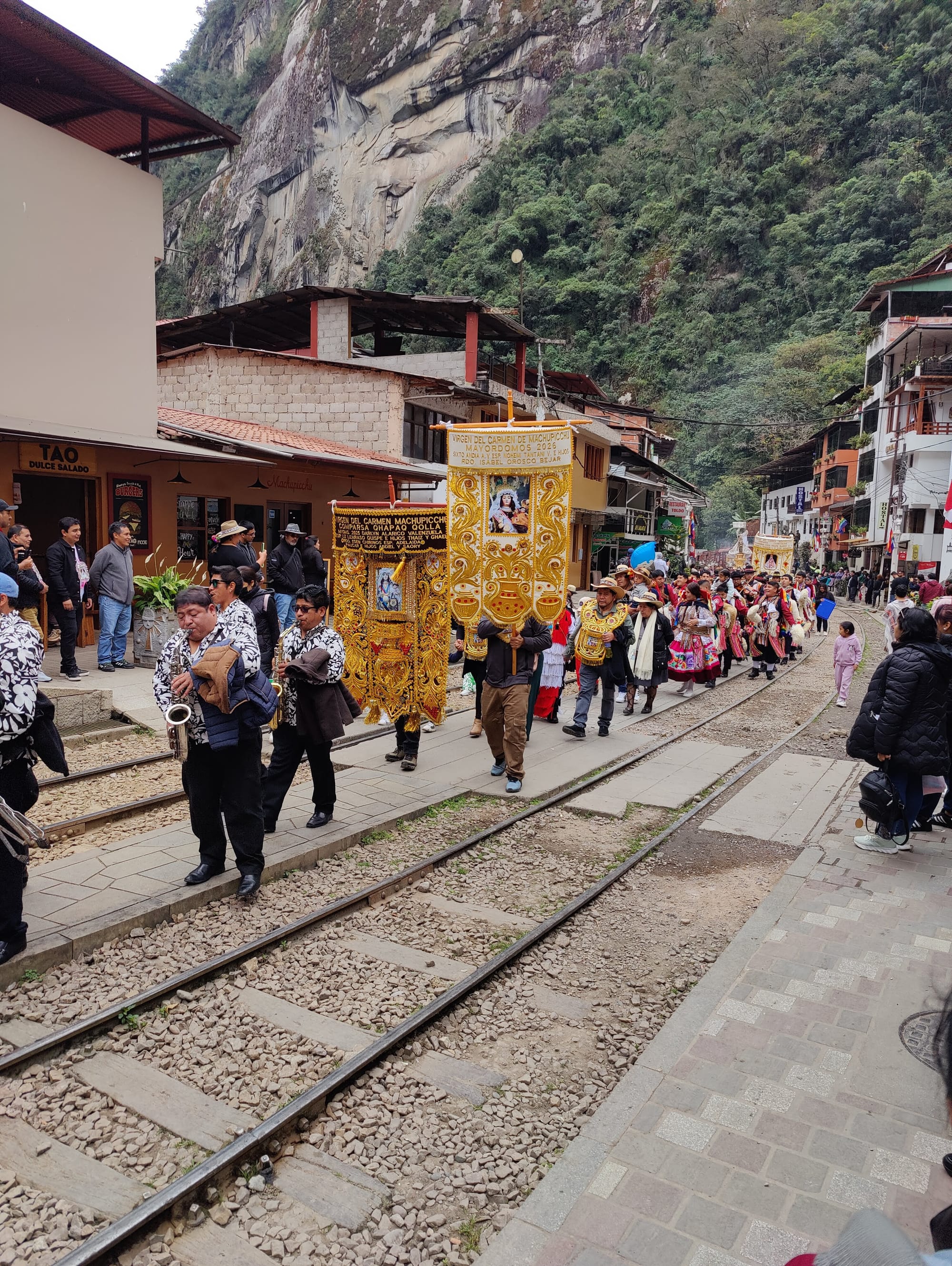 Vi overnattede i den lille by man tager bus til Machu Pichu fra, Aguas Calientes. Det var ikke det mest fantastiske sted, men vi nåede da at se et optog til ære for Virgen del carmen de Machupicchu (som grundlæggende er jomfru Maria). På fotoet ser man at optoget gik på de togskinner der løber gennem byen. Vores hotel lå ud til samme "gade".